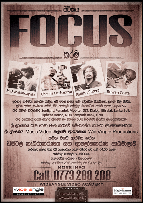Award winning lighting and camera directors, namely M.D Mahindapala, Palitha Perera, Channa Deshapriya and Ruwan Costa will be the lecture panel. You will have the opportunity to experiment the wonders of light and shade through exploring the boundless opportunities with digital photography and cinema.